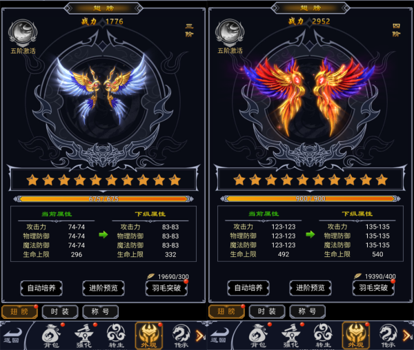 翅膀系统作为游戏基础玩法,通过消耗金币和羽毛,提高攻击力、物理防御、魔法防御和生命上限,还有五阶翅膀自动激活的翅膀专属技能:利爪;翅膀提供高额属性加成的同时,外观也十分炫酷,不同等阶的翅膀外观各不相同。目前翅膀等阶最高为15阶。