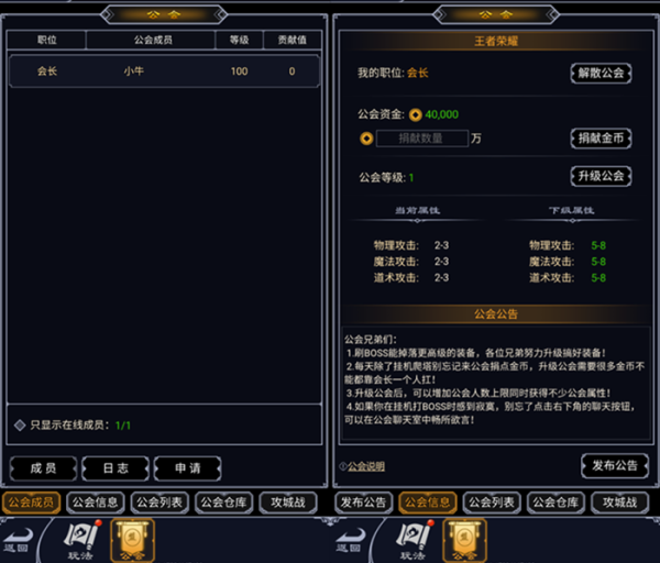 公会信息界面,会长可以解散公会,其他成员可以退出界面。所有成员都可以向公会捐献金币,用于公会升级。升级公会可以提升公会属性,公会属性对所有公会成员都有作用,会长还可以发布公会公告。