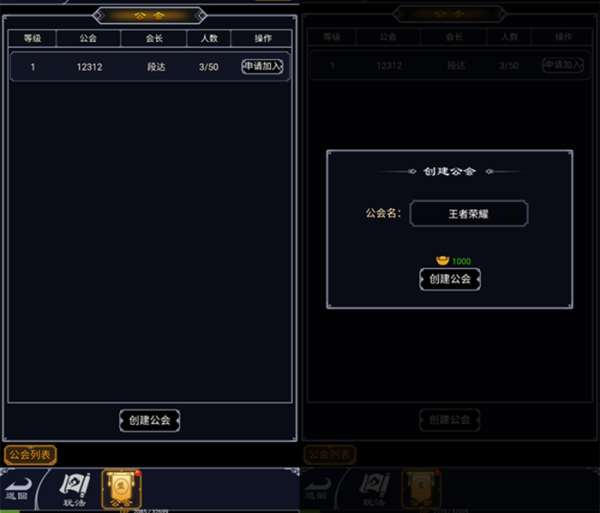 公会入口在玩法界面旁边,可以选择加入别人的公会,申请加入后需要公会会长或副会长同意后才能进入;或者选择自己创建公会,消耗1000可交易元宝并给自己的公会取名。