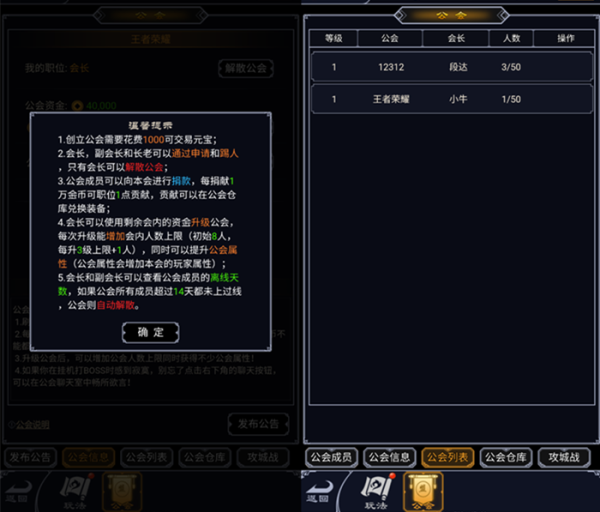 进入公会后,分为公会成员、公会信息、公会列表、公会仓库和攻城战五个功能按钮。