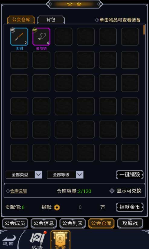 公会仓库可以从背包捐献装备到公会仓库,获得一定数量的贡献值,捐献金币也能获得一定数量的贡献值。公会所有成员都可以通过消耗贡献值兑换公会仓库的装备。