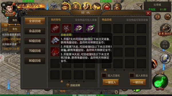 此外,需要注意的是打怪爆到的一些没用的装备记得一键回收可以获得丰厚的经验奖励,更有助于前期等级的提升,更快超越别人!