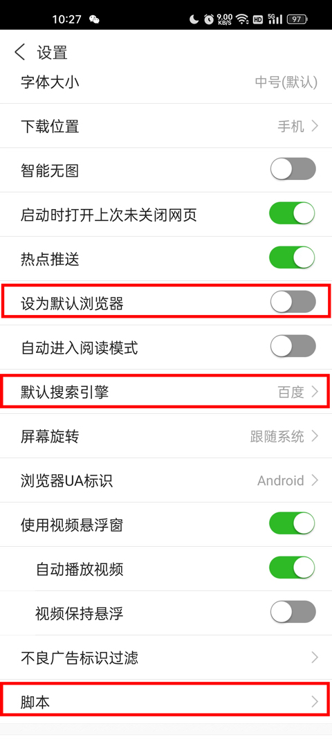 4、当你需要将其设为默认游览器和切换搜索引擎或者想添加脚本的时候,都可以进入设置页面,然后点击进行设置。