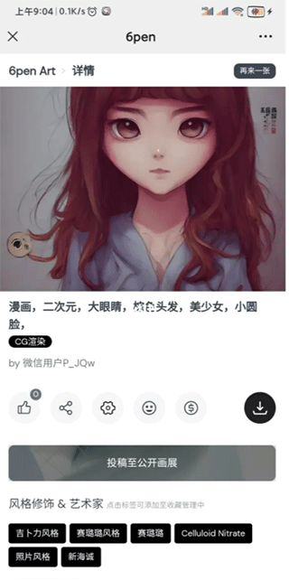 另外,6pen绘画还创造了无穷演化的共创玩法,你可以和其他用户一起,对图片进行创作,并看到变化是如何发生的,它提供的个人策展,你还能将你生成的图片组织成一个故事,或者系列,然后分享到社区,或你的朋友,这里可以看一个例子,非常的有意思。