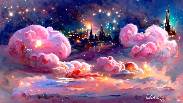 4、梦幻的夜空,闪烁着星星,巨大的粉色桃子云彩,远处的高塔和迷你城市