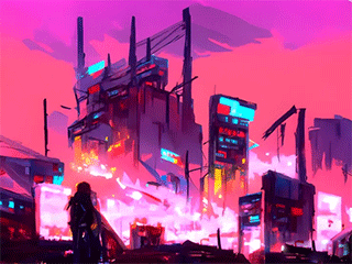 2、近处是燃烧的垃圾场,随处可见的电子设备,远处是挂满霓虹灯高楼林立的城市