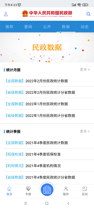 1、下载安装好国家民政部官方app,运行软件,可以看到有首页、专题、服务、互动等栏目;