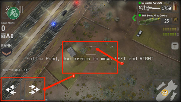 5、进入游戏战斗界面,左下角的左右箭头图标分为代表着左方向和右方向,中间的【四条杠】代表着准星,我们需要将轰炸目标对准在准星中,