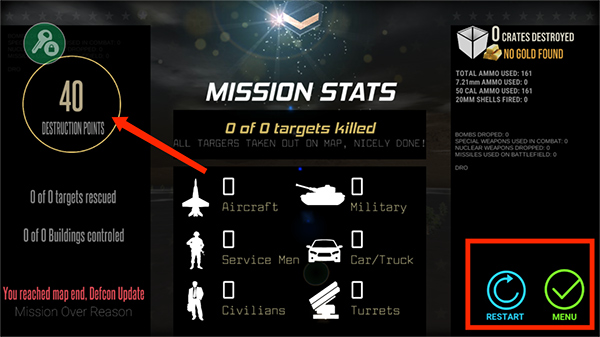 8、完成任务后,可看到相应的结算分数和获得的奖励,玩家可以选择【RESTART】再来一局,也可以选择【MENU】返回游戏大厅,以上就是核弹2的游戏玩法和攻略了。
