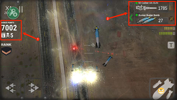 7、左上方是我们目前得分,右上方是核弹类型和剩余数量,点击可以切换不同的核弹,只需要将地面的目标都清除即可完成任务,