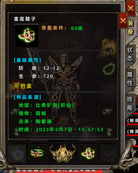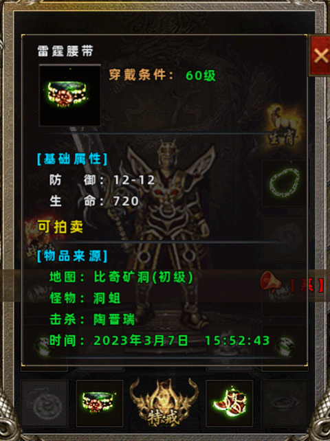 【物品来源】地图: 比奇矿洞(初级);怪物:僵尸;击杀:陶晋瑞;