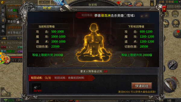 轮回系统!提升你的等级上限!提升你的切割伤害!高三攻!高切割!获取霸业装备!!伤害高人一步!