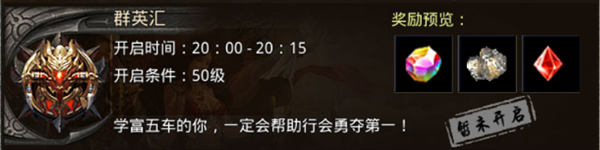 第一就是升级,大家都知道,无论在什么游戏中等级都非常重要,提升等级可以提高玩家自身属性,等级可以让玩家穿戴高级装备,可以让玩家学习高级技能,可以让玩家进入高等级地图,挑战更强大的怪物,所以每个玩家都想快速提升等级。第二,大家都想知道,在游戏中怎么获得装备,因为在游戏中装备是增加玩家属性最多,最直接的因素,装备等级越高,增加玩家的属性也越多,提升玩家的伤害也会增加,所以每个玩家都想知道某件装备哪里获得。第三,每个职业的PK技巧,玩传奇的玩家,大部分都是为了PK,在PK上面技巧非常的重要,所以这点对于每个玩家来说都非常重要。第四,那就是强化武器装备,游戏中每个玩家都想把武器强化满级,这也可以提升装备的属性,也可以增加玩家的属性,从而提升玩家的战斗力。群英汇活动介绍