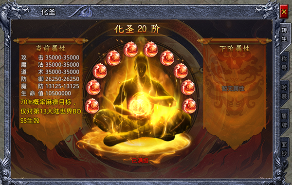 6、转生满级之后开启化圣,化圣等级最高为20阶