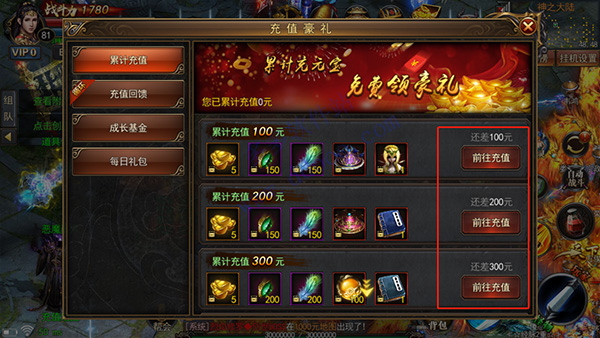 2、根据个人条件充值100--500元,充值后可点击[充值礼包]领取各阶段的充值礼包。