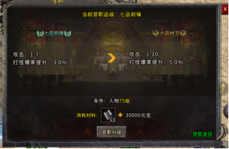 官职系统可以提升人物基础攻击,提升打怪爆率!一共14级,满级激活118点攻击,28%打怪爆率!