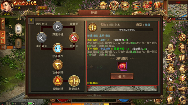 1、战士刺杀剑术技能效果:对前方两格目标造成82%的攻击力,且额外附加6点伤害。玩家距离敌人超过两格范围,施放刺杀技术技能无效,无法对敌人造成伤害。战士施放刺杀剑术技能,有一定几率MISS,无法打到敌人,无法对敌人造成伤害。