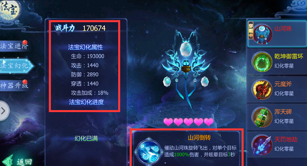 法宝幻化:当伙法宝化激活后,有多余的法宝幻化激活卡都可以用来幻化升星哦,主要是百分比属性加成,幻化进度越高,加成越高哦,所有幻化的法宝属性都可以叠加的