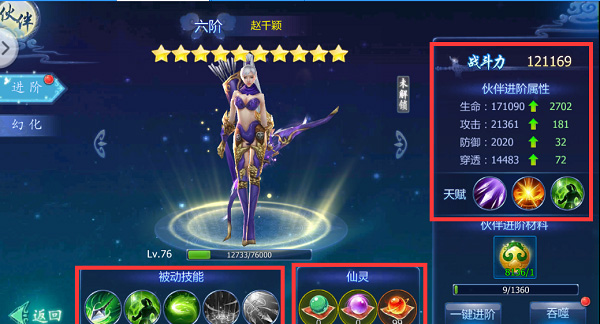仙灵培养:使用对应仙灵材料进行升级仙灵,其中飞升仙灵+2%总属性加成,最多加成+200%属性加成