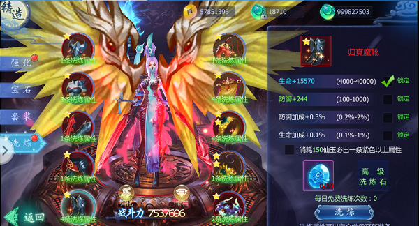 洗练属性:第一次洗炼开启第一条属性,花100绑定仙玉可解锁一条下面的属性,最多可解锁三条。花费洗炼石(洗炼石在剧情副本中可获得)可随机洗炼属性,可花费150仙玉洗炼不消耗材料且必出一条紫色或以上的属性,可锁定属性定向洗炼,每锁定一条洗炼所消耗的材料就翻倍