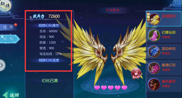 翅膀幻化:当翅膀幻化激活后,有多余的翅膀幻化激活卡都可以用来幻化升星哦,主要是百分比属性加成,和被动技能百分比属性加成,幻化进度越高,加成越高哦,所有幻化的翅膀属性都可以叠加的