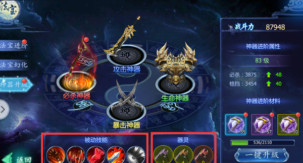 法灵培养:使用对应法灵材料进行升级法灵,其中破军法灵+2%总属性加成,最多加成+200%属性加成