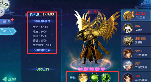 伙伴幻化:当伙伴幻化激活后,有多余的伙伴幻化激活卡都可以用来幻化升星哦,主要是百分比属性加成和被动技能百分比属性加成,幻化进度越高,加成越高哦,所有幻化的伙伴属性都可以叠加的