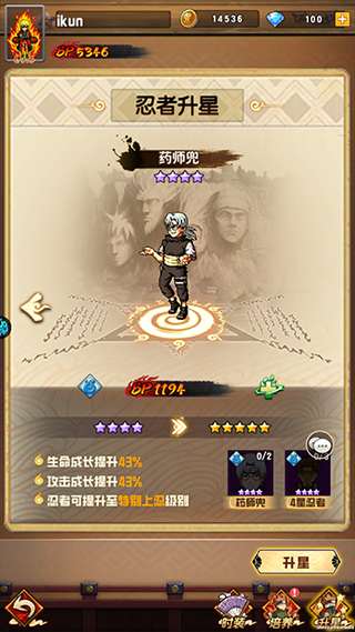 1、 招募多余的忍者,可以在忍者学堂内一键升星,变成5星忍着哦,后期便于给忍者升星大量提升战力哦。