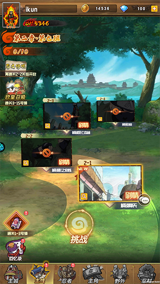 1、 进入游戏以后,领取相应的奖励,获取忍者招募卷轴,在主页面招募所内进行忍者招募,获取5星忍者后上阵做主线任务推图。