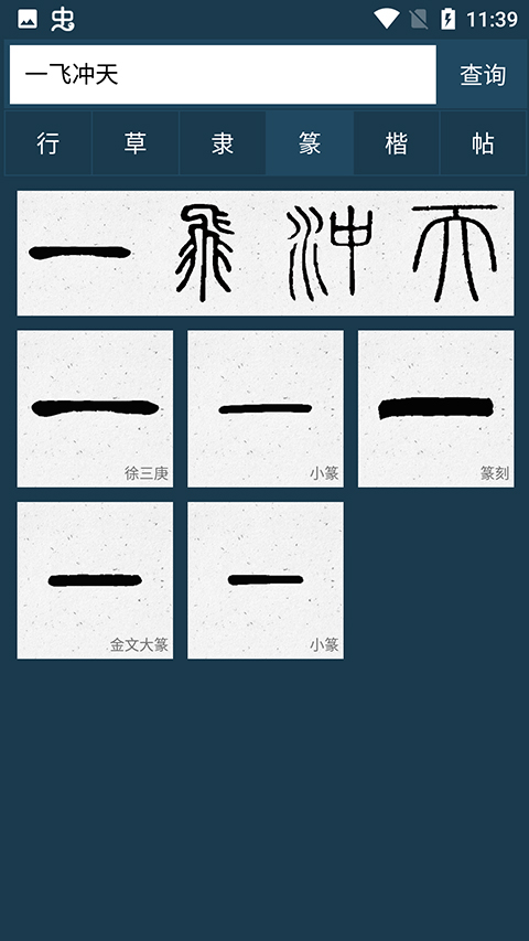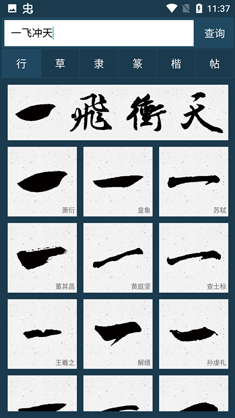 书法大字典手机版是针对爱书法的朋友设计发布的一款书法练习辅助软件,内置行、草、隶、楷等五大书法字体,能基于大数据采集技术,结合移动互联网的特性,将书法名家字体库,配合诗词曲生成书法字帖,100多万张书法字形图片及其字帖真迹单字图片,以及历代著名碑帖拓本和各种经典书法理论及教程,帮助用户任意查询汉字的拼音、笔顺、繁体字、字义、说文解字等内容。
