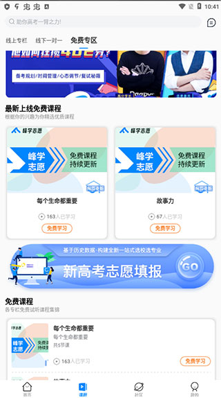 峰学志愿app是一款专为学生志愿填报而开发的软件,同时也是张雪峰老师亲自带领专业团队为高中生研究出来的一套高考志愿填报理论,里面的课程由张雪峰老师录制,内容包含高一选科指导及高考填报志愿,还有张老师个人的心得体会和技巧,能够有效的解决高考报考生的些许困扰。软件内不仅提供了志愿填报的详细介绍,还提供了多种好书阅读以及高三模拟习题可供用户线上查看,内置家长专栏、读书分享、读书分享和大学那些事儿等专栏让用户浏览,让用户轻松了解到这些情况。除此之外,峰学志愿首页推送各大高校介绍,通过该软件学生和学生家长可以全面了解各高校信息,而用户可以通过这款软件来填报学校,手把手教学生填志愿,降低选择专业时被调剂的风险,同时还会基于MHOF算法,结合最新考试成绩、招生计划,预测出分数线范围,基本准确,当然也会尊重个人意向及目标的基础,辅助生成完整的志愿表,提高选择的效率,需要的话欢迎来下载体验。
