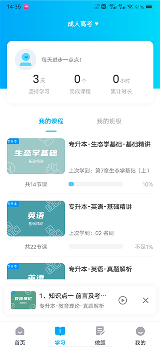 登录成功后,点击页面下方菜单栏中的【学习】栏目进入班级与课程界面可以看到你正在学习的课程和班级。