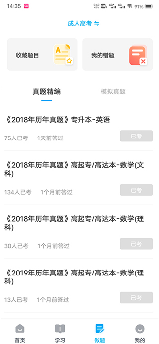 点击页面下方菜单栏中的【做题】栏目进入练习题界面,共有章节练习、历年真题和模拟真题三种类型提供做题。