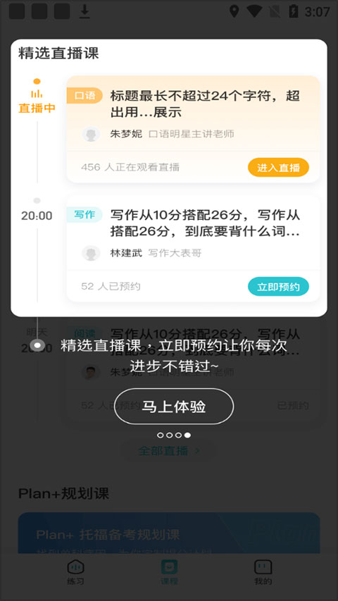 1、下载安装好托福考满分应用,进入软件首页,如图所示你可以修改更新你的学习计划签到还会有奖励。
