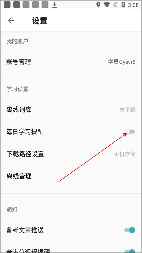2、在设置界面中找到每日学习提醒并点击打开即可。