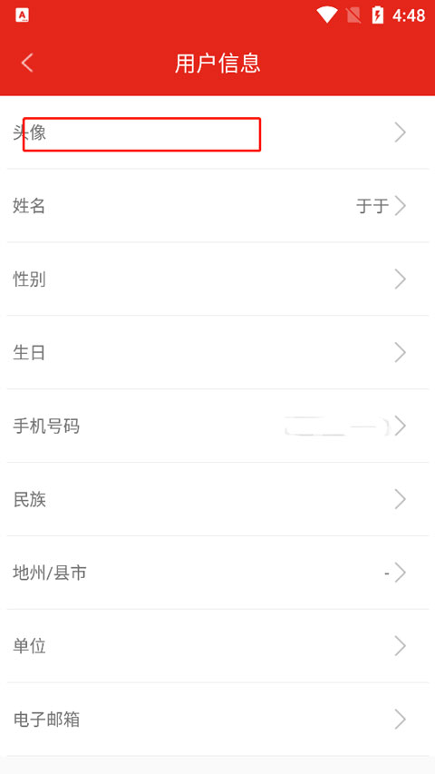 5、在该页面完善用户信息,如头像、名字、地区、单位,我们头像;