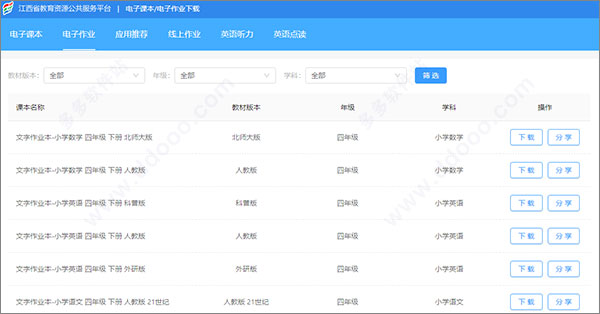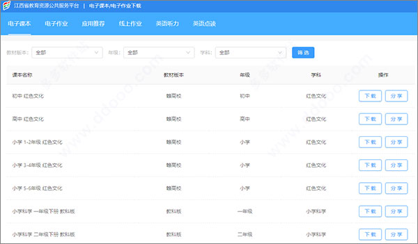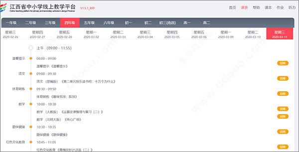 答:赣教云平台以及“赣教云”公众号的“资源应用”菜单中已经开放电子课本、电子作业以及各年级学习课表下载链接。