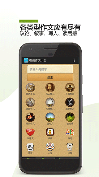 1、20000篇离线作文,什么类型作文都有(议论,说明,日记,杂文,叙事等等)2、每日一文在线听作文,晚上睡觉好帮手