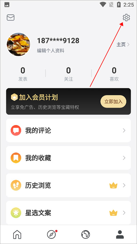 句读app会用户提供了商务合作的窗口,用户可以登录并打开句读app,进入我的页面点击右上角的设置图标(下图红色箭头所指)