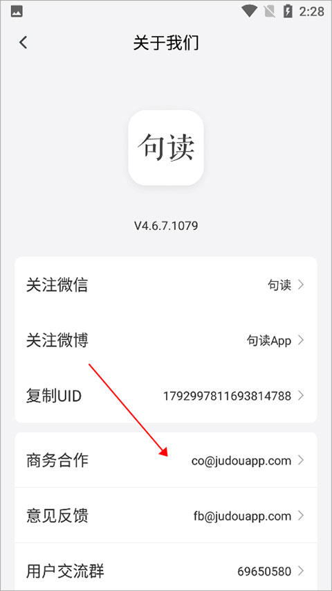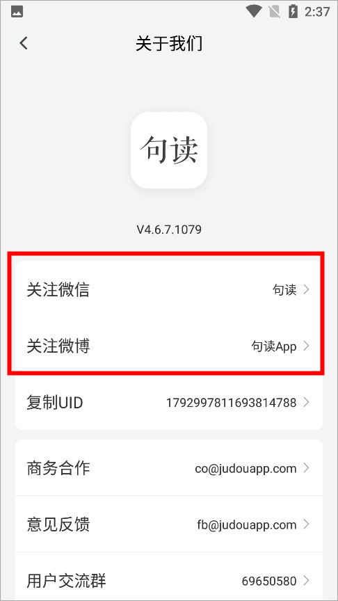用户可以前往句读app【我的】页面点击右上角的设置图标,在打开页面中找到关于我们进行点击,可以看到如下页面,点击【关注微信】、【关注微博】即可打开对应平台进行关注