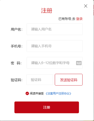 用户注册方式为手机注册:输入用户名→填写正确手机号→设置密码→获取验证码→同意注册协议→注册成功
