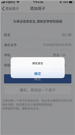 3、选择孩子所在学校和班级,完成后点击【确定】。