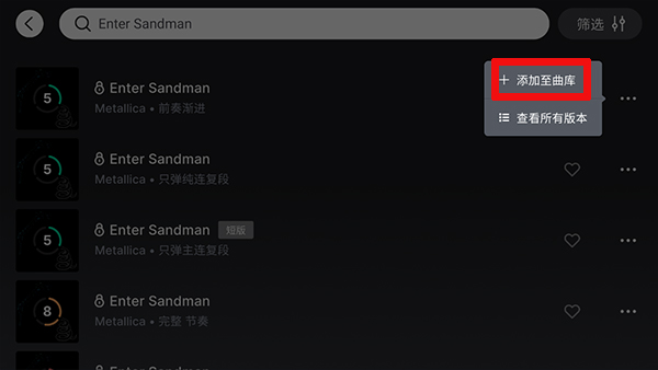 3、搜索查找自己需要的曲目,点击曲目右边【…】图标,弹出菜单,选择【添加至曲库】