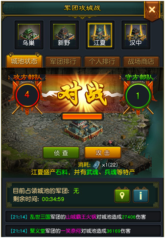 2.每座城池都会有一位名将驻守,只有所有人齐心合力将其击败才能进行城池争夺。对名将进行最后一击的军团享有该城池的所有权,其他军团只有将此军团的驻守军队全部打败后才能抢夺到该座城池的所有权。
