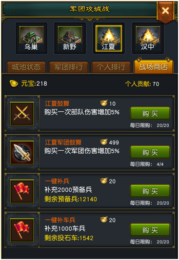 5.系统还贴心的为各位玩家准备了战场商店,只有在攻城战开始时才会开放。如果觉得攻城有困难,可以直接在战场商店中购买各种BUFF以及一键补兵。