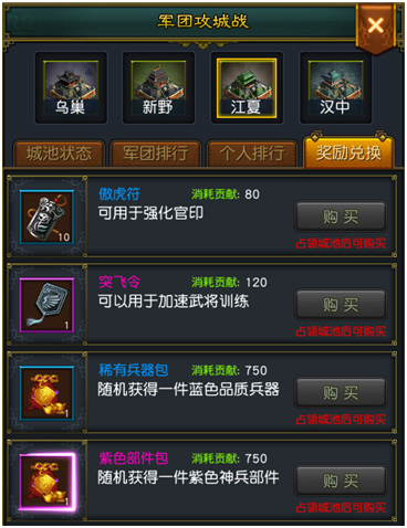 3.每个城池盛产的物资不同,攻打城池可以获得大量的对应资源。占领城池的军团,不仅能得到资源BUFF加成,还能在城中购买特产物资,甚至有机会购买独一无二的绝世神兵部件。