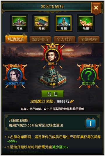 1.活动开始后,所有拥有军团的玩家都可以参与,当然,能听从军团的统一指挥,能更有效率的进行攻城。