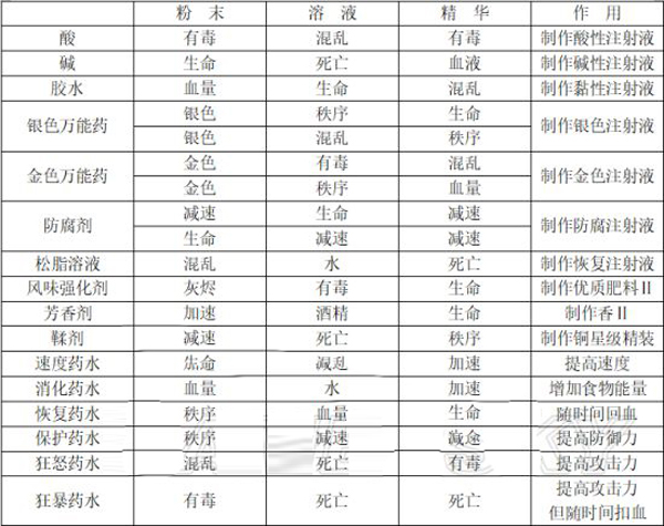 原料有八种常规类型:加速、减速、血量、有毒、秩序、混乱、生命、死亡,它们各自有对应的颜色