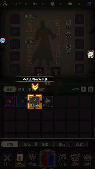 进入背包系统后,点击装备可以查看详细信息。期间你还能选择出售、加锁或穿戴!