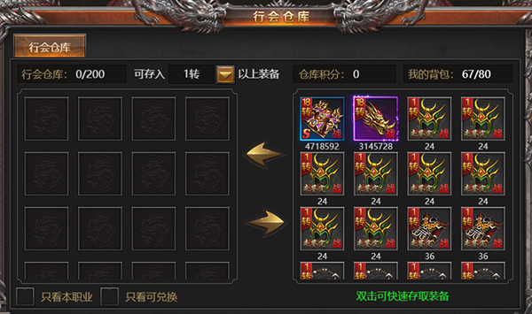 1、行会仓库:捐献装备可以获得仓库积分,消耗仓库积分可兑换装备